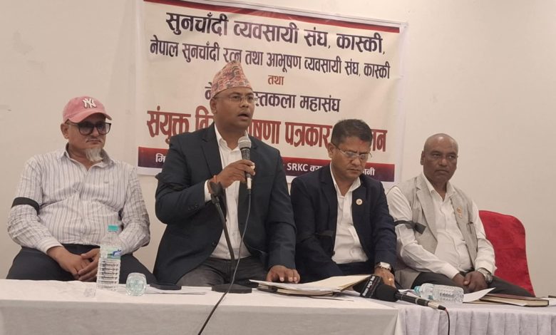 नेपाल सुनचाँदी व्यवसायी महासंघ, नेपाल सुनचाँदी रत्न तथा आभूषण महासंघ, र नेपाल हस्तकला महासंघले संयुक्त प्रेस विज्ञप्ति जारी गर्दै सरकारले लागू गर्न खोजेको कर नीतिले सुनचाँदी, हिरा, जवाहरात तथा हस्तकला व्यवसाय मात्र नभई आम उपभोक्तालाई समेत प्रत्यक्ष असर पार्ने बताएका छन्।