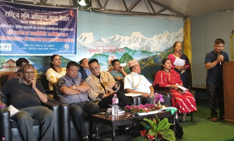 भूमिअधिकार मञ्च कास्की अध्यक्ष प्रेम बहादुर गुरुङको अध्यक्षतामा भएको कार्यक्रममा स्वागत भूमिअधिकार मञ्च पोखरा महानगरका अध्यक्ष कृष्ण परियार र संचालन मञ्च कास्कीका सचिव कुमारी गुरुङले गरेकी थिईन ।