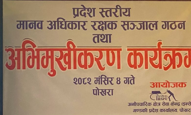 प्रदेशस्तरीय मानव अधिकार रक्षक सञ्जाल गठन तथा अभिमुखीकरण कार्यक्रम पोखरामा सम्पन्न भएको छ । प्रदेशभरि मानव अधिकार संरक्षण तथा निगरानी कार्यलाई प्रभावकारी बनाउन उद्देश्यसहित आयोजित उक्त कार्यक्रमको आयोजना अनाैपचारिक क्षेत्र सेवा केन्द्र (इन्सेक), गण्डकी प्रदेशले गरेको हो । अभिमुखीकरणका क्रममा मानव अधिकार रक्षकहरूको भूमिका, दायित्व, जोखिम व्यवस्थापन, तथ्य संकलन तथा प्रतिवेदन विधि लगायतका विषयमा छलफल भएकाे थियाे ।