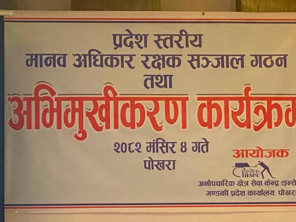 प्रदेशस्तरीय मानव अधिकार रक्षक सञ्जाल गठन तथा अभिमुखीकरण कार्यक्रम पोखरामा सम्पन्न भएको छ । प्रदेशभरि मानव अधिकार संरक्षण तथा निगरानी कार्यलाई प्रभावकारी बनाउन उद्देश्यसहित आयोजित उक्त कार्यक्रमको आयोजना अनाैपचारिक क्षेत्र सेवा केन्द्र (इन्सेक), गण्डकी प्रदेशले गरेको हो । अभिमुखीकरणका क्रममा मानव अधिकार रक्षकहरूको भूमिका, दायित्व, जोखिम व्यवस्थापन, तथ्य संकलन तथा प्रतिवेदन विधि लगायतका विषयमा छलफल भएकाे थियाे ।