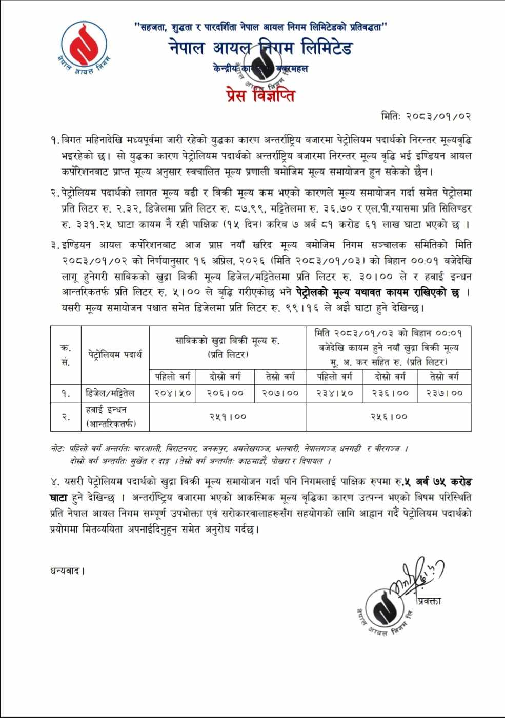 निगमका अनुसार, पेट्रोलको मूल्य भने यथावत राखिएको छ ।त्यस्तै, आन्तरिकतर्फको हवाई मूल्य पनि प्रतिलिटर ५ रुपैयाँले वृद्धि गरिएको छ ।