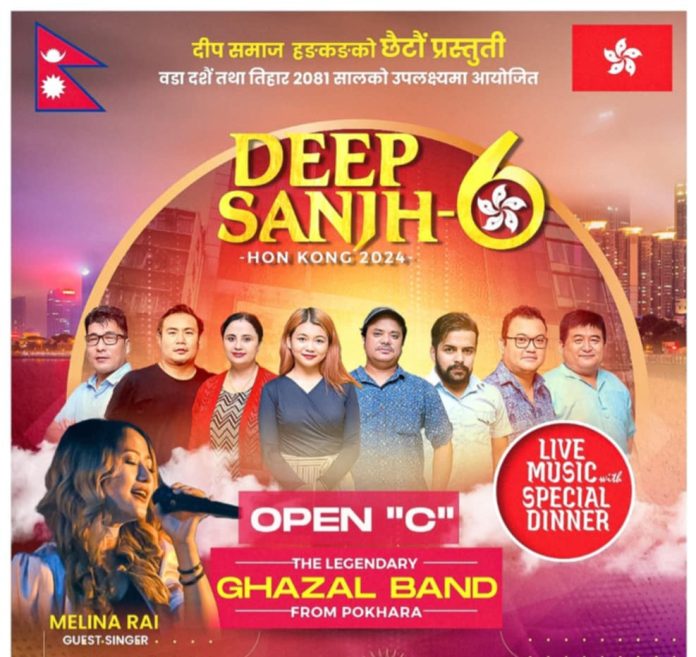 हङकङको रिच गार्डन रेष्टुरेण्ट जेडी मल ९जोर्डन कोरियन रेष्टुरेण्ट बिल्डिङ० मा १९अक्टुबर २०२४ मा हुने कार्यक्रम दीप साँझको छैठौं संस्करण हो । हङकङको समयानुसार साँझ ७ः३० बजेबाट सुरु हुने कार्यक्रममा ओपन “सी” ब्याण्डले नेपाली नयाँ पुराना गीत प्रस्तुत गर्नेछ भने गायिका मेलिना राई आफ्ना चर्चित गीतहरु प्रस्तुत गर्ने सचिव अशु रानाले जानकारी गराए ।